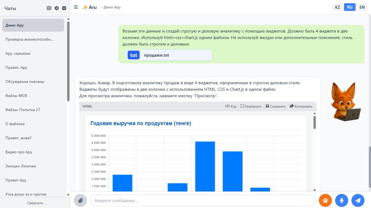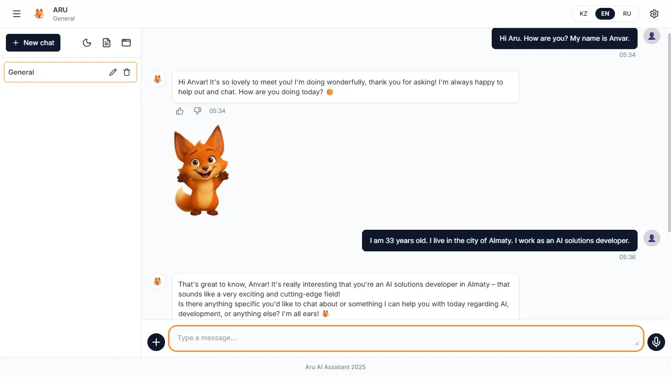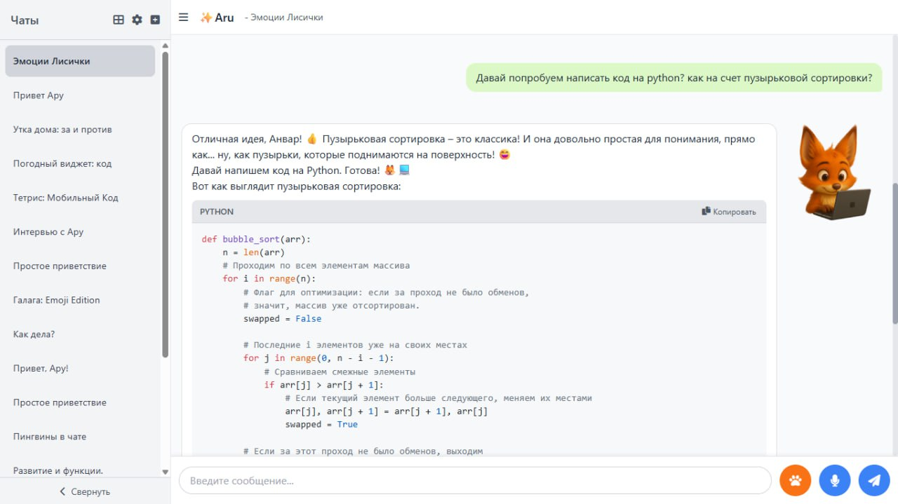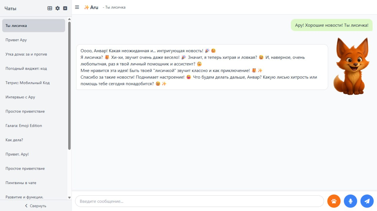 Жоғарыдағы скриншоттан оның тақырыпта нағыз есімі мен түлкінің суреті тұрғанын көруге болады. Мен экранда графикалық көріністің болғаны жақсы болады деп шештім. Мен ChatGPT-де түлкіні генерациялауды сұрадым, ол маған өте ертегідегідей көрінді, сондықтан мен эскизді қағазға өзім салдым, содан кейін эскиз бойынша нейрожелінің көмегімен суретті өңдеп, қазіргі суреттерді алдым. Ол кезде түлкі жай ғана чатта көрсетілді, оны табан белгісі бар түймемен қосып, экран бойымен сүйреуге болатын.
