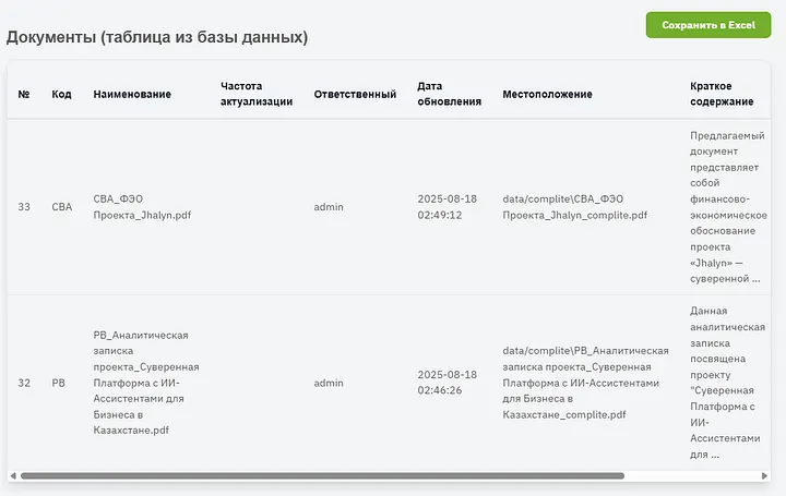 Сақтық үшін екінші құжатты да өңдедім. Енді маңызды сәт. Құжатты әр сақтаған сайын, ол туралы ақпарат арнайы кестеге орналастырылады. Бұл іс жүзінде құжаттардың жаңа тізілімі, ол кодты, атауды, құжат орналасқан жолды және оның summary — құжаттың мәні туралы қысқаша үзіндіні сақтайды (бұл болашақ жұмыс үшін маңызды). Кестенің өзін параметрлерден көруге болады, бірақ бұл туралы кейінірек. Әзірге деректер жинаушыға өтеміз.