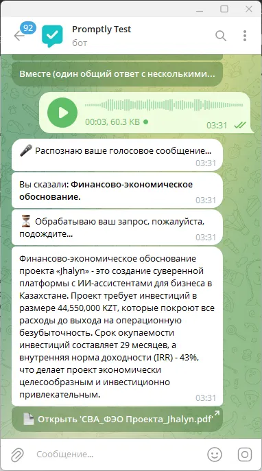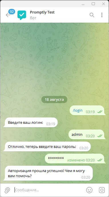 Боттың жұмысын көрсету қалды. Менде Promptly жобасы бар, негізінен бұл жобадағы бот коды сол, тек қатты өзгертілген және әлдеқайда жеңілдетілген. Тесттік токен де содан қалды.