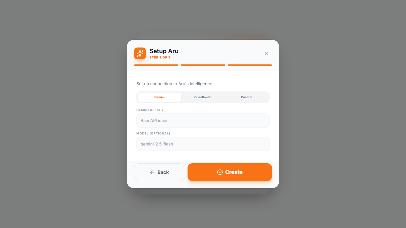 Aru Ai — бұл кез келген ыңғайлы әдіспен модельді қосуға болатын жеке жасанды интеллект көмекшісі. Gemini, Open Router немесе Ollama/LM Studio арқылы жергілікті модельдер. Қазір Арудың жеке LLM моделі жоқ (әзірге жоқ).