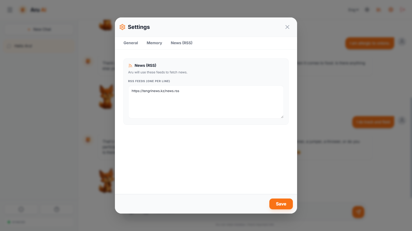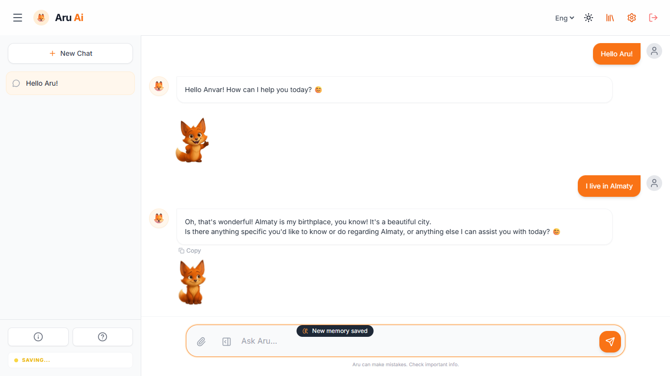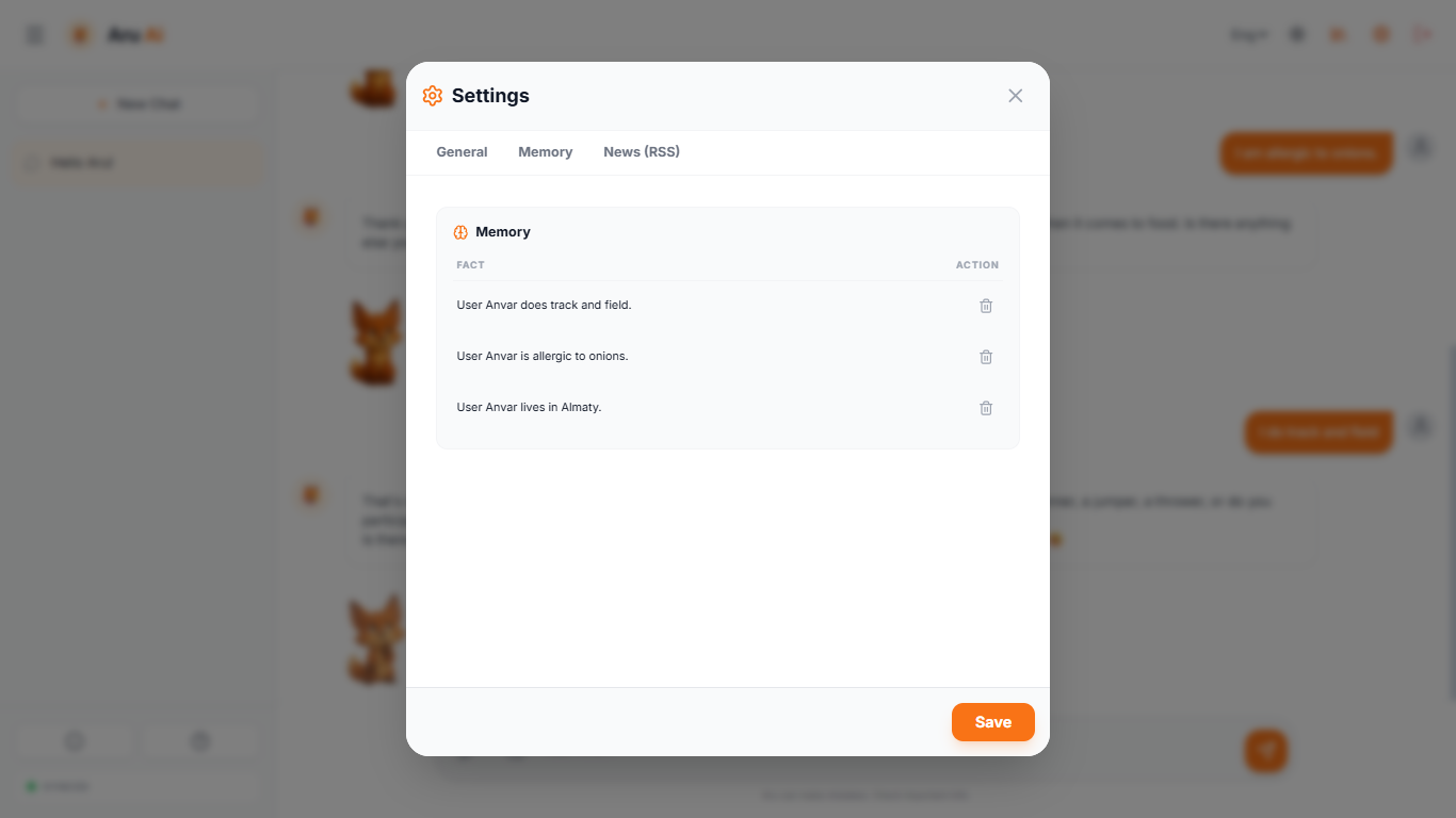 Ару сіз туралы деректерді, маңызды болып көрінетін кез келген фактілерді есте сақтай алады — сіздің атыңыз немесе маңызды адамдардың есімдері, аллергиялар, қалауларыңыз, аурулар, хобби, кез келген тағам немесе музыка. Мұның бәрі тек сіздің жеке дерекқорыңызда мәтіндік деректер мен эмбеддингтер түрінде сақталады.